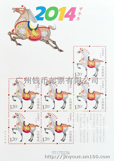 【藏品名称】2014-1《甲午年》马年生肖小版票【图案面值】(1-1)T 甲午年 1.20元【邮票规格】36×36毫米【齿孔度数】13 度【整张枚数】6枚【整张规格】128×180毫米【版 别】影写【防伪方式】防伪纸张、防伪油墨、异形齿孔、荧光喷码【设 计 者】陈绍华【责任编辑】王静【印 制 厂】北京邮票厂