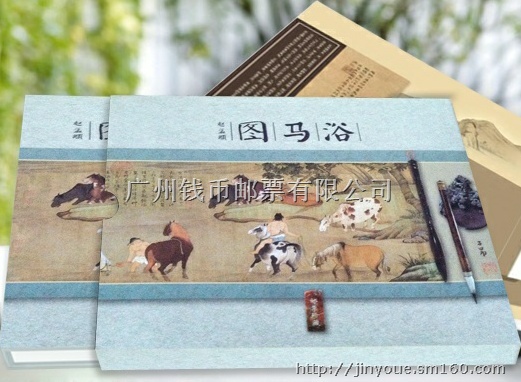 内容: 浴马图套票及型张、甲午年小版、浴马图版票、丝织封一套、太阳神鸟4枚版个性化邮票、高仿宣纸原画一幅。