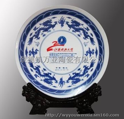 景德镇万业陶瓷生产礼品瓷盘、装饰盘、粉彩盘、挂盘、青花瓷盘、纪念盘、工艺品摆设瓷盘具有不怕日晒雨淋、耐火烧刀刮,能经历百年沧桑、永不褪色、可传世收藏的价值。这是任何一种影像制作技术都无法比拟和不可取代的重要特征。可用瓷盘制作纪念像、周岁纪念像、寿庆纪念像、毕业纪念像、婚庆纪念像、个人写真艺术像、旅游纪念像;根据客户的要求用精美的瓷器为企事业单位制作带有像片、文字的奖品和纪念品瓷质名画。用于宾馆、酒店、家庭的装饰.“陶瓷工艺礼品纪念盘”适用于商务活动、会议纪念、周年庆典、开业乔迁、团体集会、外事交流、宣传推广等各项事宜。