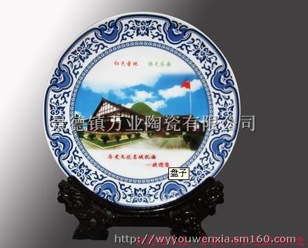 景德镇万业陶瓷生产礼品瓷盘、装饰盘、粉彩盘、挂盘、青花瓷盘、纪念盘、工艺品摆设瓷盘具有不怕日晒雨淋、耐火烧刀刮,能经历百年沧桑、永不褪色、可传世收藏的价值。这是任何一种影像制作技术都无法比拟和不可取代的重要特征。可用瓷盘制作纪念像、周岁纪念像、寿庆纪念像、毕业纪念像、婚庆纪念像、个人写真艺术像、旅游纪念像;根据客户的要求用精美的瓷器为企事业单位制作带有像片、文字的奖品和纪念品瓷质名画。用于宾馆、酒店、家庭的装饰.“陶瓷工艺礼品纪念盘”适用于商务活动、会议纪念、周年庆典、开业乔迁、团体集会、外事交流、宣传推广等各项事宜。