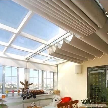 室内双轨折叠式天幕帘可用于商厦、商场、宾馆、写字楼、等大型采光顶,也可用于高级住宅阳光房