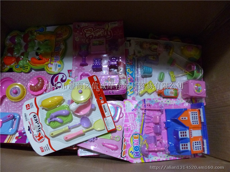 信诚库存玩具批发大量到货过家家类样品玩具,产品全新的,款式非常多,成色非常漂亮,几乎是全新的,大部分都是片装的,也有少量盒装的,而且都是很轻的,称斤批发,一片也就一两块钱而已,一个0.307立方的箱子可以装42斤左右,能装一百多片,这些算数塑料制品,我公司目前存货5吨餐具,饰品玩具,这些货在国外很受欢迎。