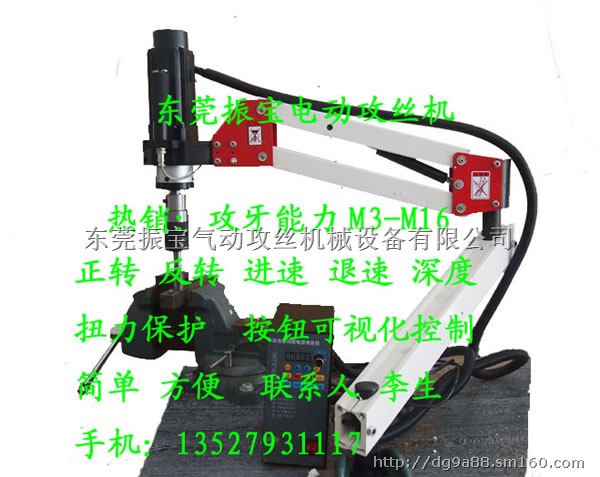攻牙能力M3-M16,电压:220V 功率:600W 转速300转/分钟 配备夹头区间任意选择7个夹头,工作半径1000MM 价格:4800元