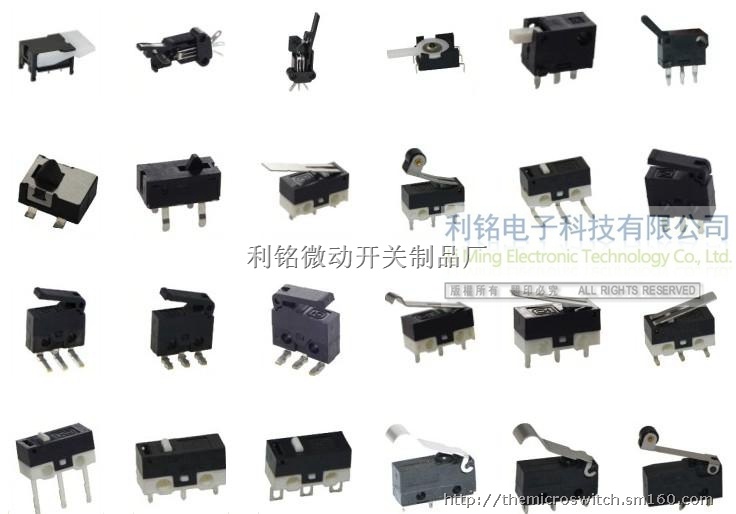 大小功率微动开关生产/大小电压电流微动开关制造 利铭微动开关制品厂成立于1981年,专业设计、开发和鼠标微动开关,鼠标开关,微动开关,船型开关,翘板开关;广泛用于手机、MP3、MP4、数位相机、鼠标、键盘、汽车部品、数码音响、家用电器、办公设备、测量仪器、工业控制设备等。