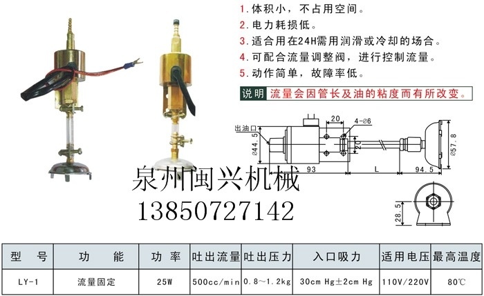 磨床电子油泵,电磁泵;依电磁感应原理动作,电力损耗低,体积小,占用空间少,可连续使用作润滑或冷却功能,机械性高,可搭配流量调整阀,调节流量。(吐出流量会因出油管长度及油品粘度而改变)