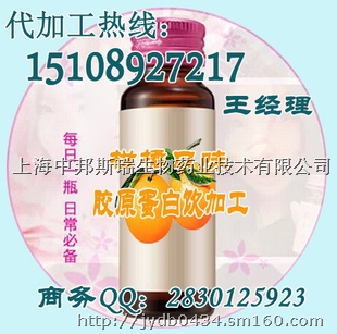 柑橘味胶原蛋白饮OEM代工 上海中邦斯瑞QS产品生产线:沙棘果汁饮料加工、柑橘味胶原蛋白饮OEM代工、胶原蛋白蓝莓果味饮代加工贴牌、系列果味胶原蛋白饮OEM、葡萄果味饮料加工、各类果味饮料OEM加工、系列植物饮料加工、小规格玻璃瓶果蔬汁饮料加工、酵素加工、50ml混合果汁饮料加工、玛咖饮料OEM加工厂。欢迎到厂考察!咨询热线:15108927217王琼妹 经理。