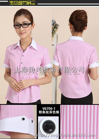 女职业衬衫(短袖、长袖,素面、直条、花纹、格纹):时尚的面料,新颖的款式,加上精致的做工.。无论是单穿,或是外搭各款职业套装,简洁明快的衣着都特别受到职场白领的热崇。衬衫被衣着考究的女士视为自己在职场的第二层肌肤。好的衬衫搭配职业套装时可以从容游刃于瞬息变化的职场,直接外穿则可凸显曼妙完美身材。