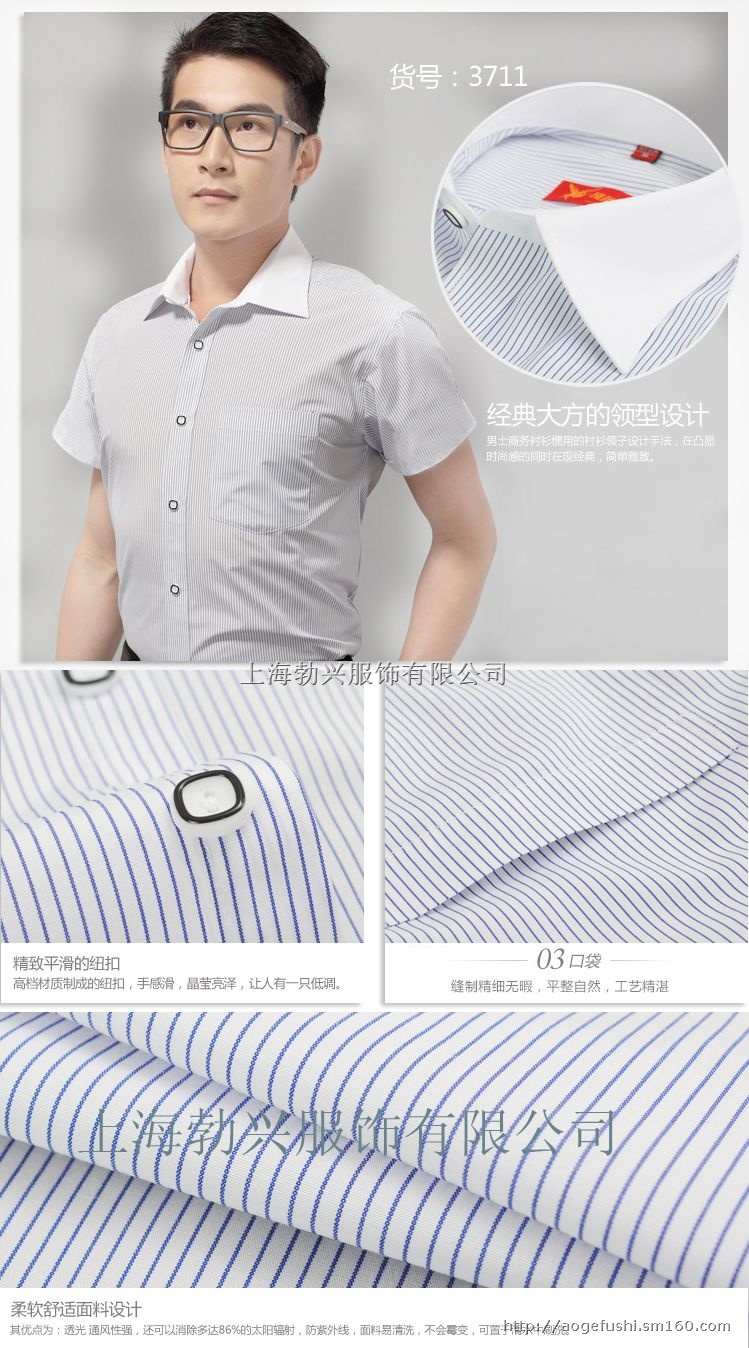 商务正规衬衫系列:正规场合穿着的商务衬衫,面料一般选择精致、紧密、绸洁、平整、素雅和流行的面料,辅料与面料相协调,领衬、袖口衬、门襟衬与衬衫的款式、风格和色彩适应;纽扣的颜色、风格、质地与面料、品牌相谐匹配;绣花线、缝纫线等与面料的颜色、强度、缩水率等相一致。