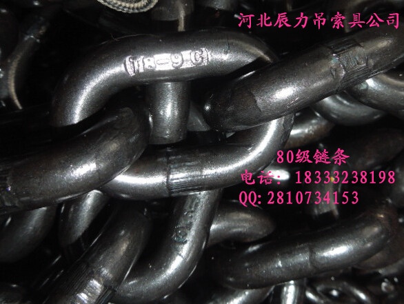 采用高强度锰钢制作而成,链条保证4倍安全系数,2.5倍试验载荷。按照它的强度等级分为G30,G40,G70,G80,G100.我们公司一般生产的是80级链条和100级链条,因市面上80级链条需求量比较大,所以目前公司还是以生产80级链条为主,如客户需要100级链条,则需要提前定做。