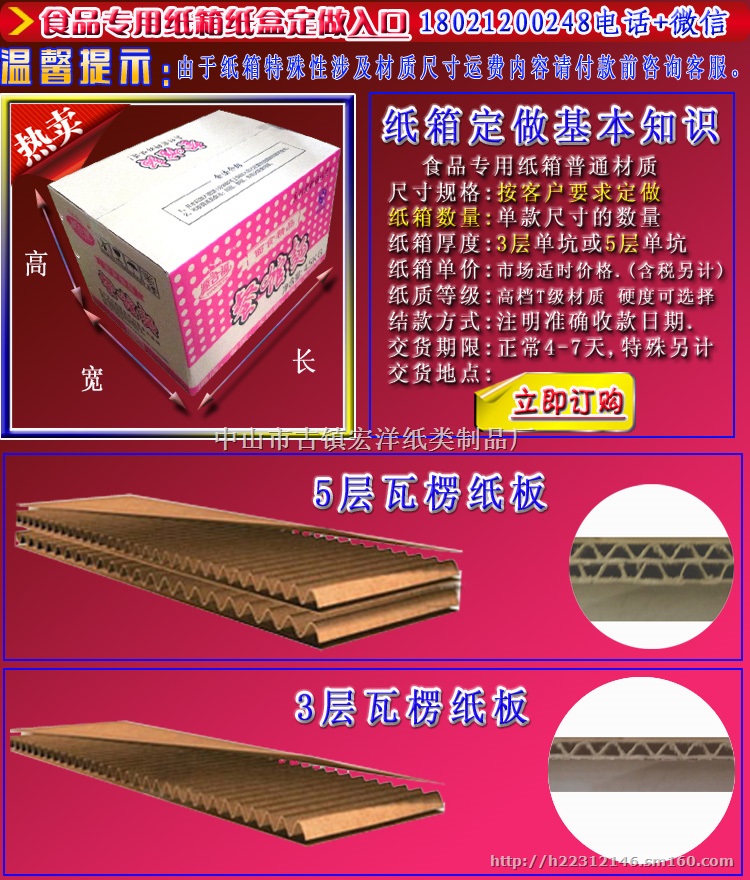 中山市宏洋纸箱包装厂,厂家厂价批发定做纸箱、包装盒内盒、插扣底盒、飞机盒和天地盖纸盒.现货快递纸箱和物流发货搬家纸箱.也可以按客户要求定做尺寸和订做材质,按要求印刷LOGO.厂家供应有价格和质量优势.纸箱厚度分3层和5层.所有新老客户从阿里巴巴下单.材质等级:C,B,A,K,W,V.新增加优质牛卡纸:D,H,F,E坑牛皮纸,四种(耐破度和韧性都超过以前的所有材质).将会有更多价格和支付优惠.