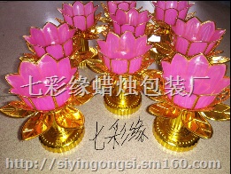 立体莲花蜡烛,中部由荷叶莲花,下部是带字‘烛台’上部荧光粉色莲花。实体用蜡少,由配件加蜡制造成本不高于两块。