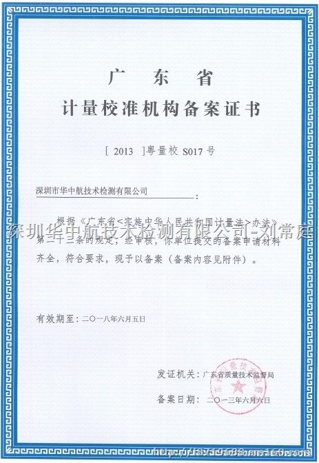 深圳市华中航技术检测有限公司是经中国合格评定国家认可委员会(CNAS)认可,认可号CNAS:L4210。通过ISO17025国际计量准则要求,获得与CNAS签署互认多边协议国家和地区实验室认可机构承认,所出具的校准证书和检测报告得到国际实验室认可,合作组织多边互认协议(ILAC—MRA)其它成员的承认和认可。
