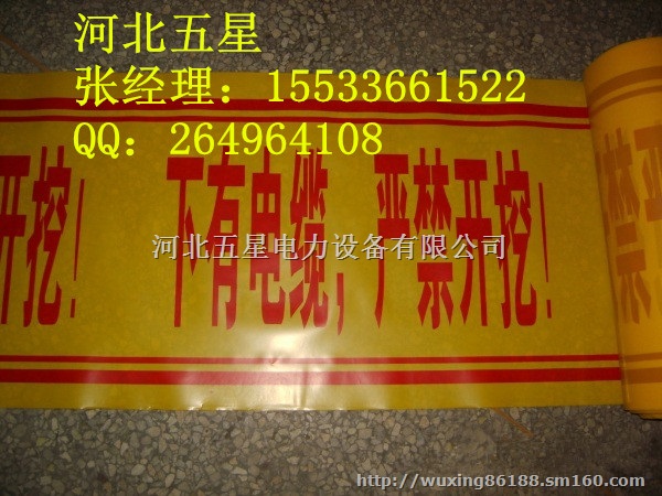 河北五星电力设备有限公司警示带又称标记带,广泛地应用于各种直埋式燃气管道、输油管道、城市给排水等气、液管道输送系统、电力电缆、通讯光缆等关于国计民生的第五类运输体系及信息传输系统的警示防护,特别对各种情况复杂的城市管网施工现场、道路施工现场、交通事故现场保护,建筑建设施工现场、田野中的直埋管线有着明显的防护警示作用,它施工方便,施工与埋管同时进行,埋覆于地下与管线中间,铺设在管道上面30-50cm处,起到警示标志作用,以免今后开挖施工时管线受无谓损伤,而造成重大事故,避免因意外损坏造成巨大的财产和经济损失,是各种直埋式管道、线缆安全防护的经济有效、简单易行的用品。