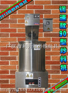 90型:机器大型,机宽93公分,长123公分,整机高175公分。本机器配备的是液化气、天然气、管道气三用节能猛火炉,炉四周封闭为你节约燃气40%左右,火力大小自由调。配用220V、1500瓦单相异步电动机、排烟扇,整机工作1个小时约消耗2度电,配备直径90公分,高60公分不锈钢锅,适合多个中小店面批量炒料,每次炒料在500斤以下的店,不占用厨房空间,移动,清洗方便。适合多人操作尤其是女士操作必须配备帮手,不能单独操作。可作为前厅展示炒料的最佳设备。