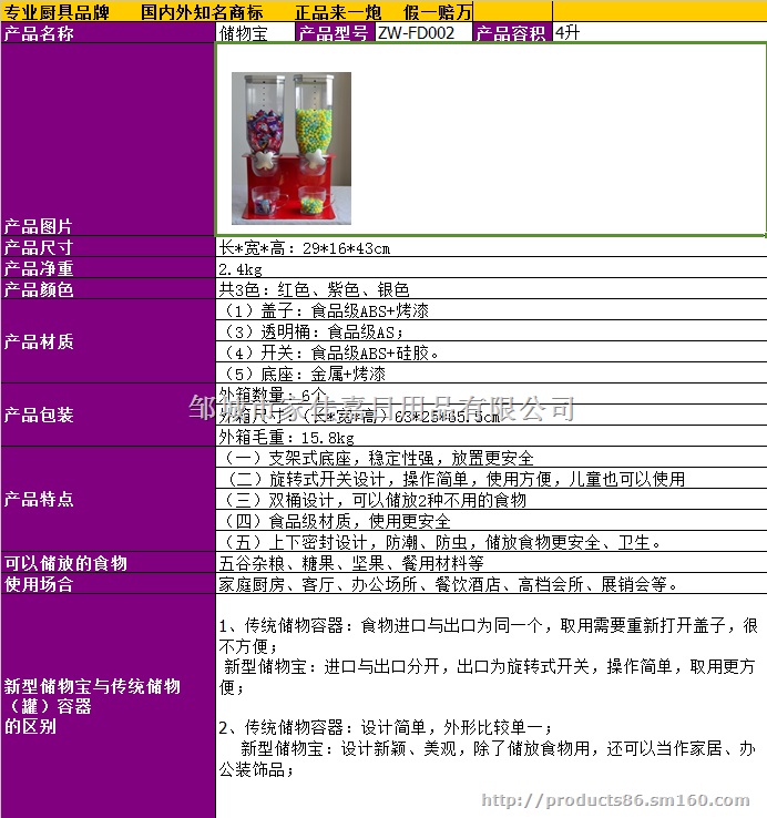 储物宝系列产品的作用:储放食物卫生方便,可以让储存的食物不潮湿,不招虫,避免了和其他物品混放造成窜味和二次污染。使用操作简单安全,可以更好的控制所需物品数量。外观新颖美观,可以放置在普通家庭的厨房,客厅,可以放置在办公场所,餐饮酒店和高档会所。产品实用价值高,又可以是新颖的装饰品,更是销售相关食品厂家的展示用具和最佳的促销用品。在欧美发达国家已经成为普通家庭的必备神器,未来几年储物宝也会成为国内市场必不可少的高档储物用具。