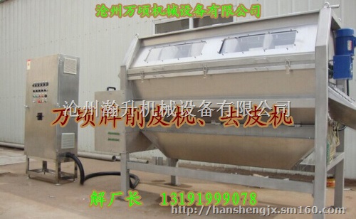 万顷牌荸荠去皮机包括机架、传动装置、切削装置、输送装置和自动控制系统;切削装置包括刀杆、切刀和弹簧;传动装置包括电机和减速器;输送装置包括送料链、推料链、推料杆和接料筐;控制系统包括电控箱和行程开关。由于设置了自动输送装置和弹性仿形切削刀具,使荸荠可通过送料链输送到接料筐,接料筐浮动定位,再由推料杆自动推进圆周装有多把刀具的切削框架进行切削。刀体与刀杆上的弹簧可使刀具沿凹凸不平的表面仿形切削,保证低凹处能切削干净,高凸处切削皮薄,还可最后切瓣便于掏籽。