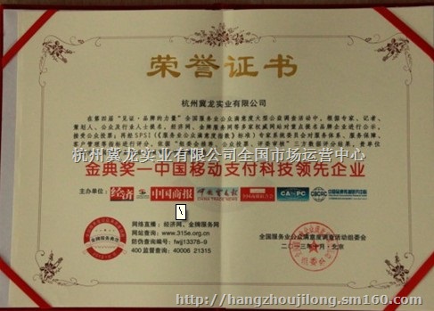 杭州冀龙实业有限公司荣获了:金典奖----中国移动支付科技领先企业、 金典奖----中国移动支付用户满意首选品牌。
