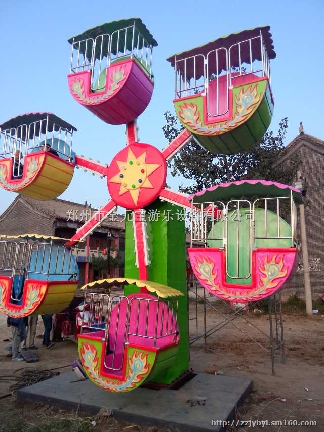 郑州金元宝游乐设备有限公司 观览车是家长陪伴儿童一起游玩最理想的游乐设备。该项目不但性能优越,而且以其新颖的星星月亮造型、华丽迷人的彩灯装饰、别致的单臂支撑结构、柔美动听的背景音乐,衬托出一幅温馨浪漫的欢乐场景,深受游客的欢迎,每个吊篮可以乘坐2人,另外可以根据用户的要求定做。 这种观览车是我公司的新品,它不同于摩天轮,属于小型的观览车。观览车上的每一个座舱就像一个个的小吊篮,每个吊篮可以乘坐两人。观览车上的吊篮在动力的带动下慢慢的旋转,游客坐在吊篮里可以尽情的享受,周围的美景可以让你一饱眼福!