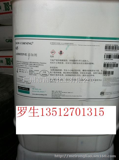 道康宁DC-65消泡剂:水性有机硅消泡剂、脱泡剂;60%有效成分,可有效控制水性涂料与油墨中的泡沫;良好的兼容性且不易产生瑕疵,不影响光泽和透明度,可提高油墨/涂料的流平性、润湿性、耐磨性和平滑,不含烷基酚环氧乙烷(APEO)加成物,可在研磨或搅拌时添加,或生产结束后补加,添加量0.05-0.3%