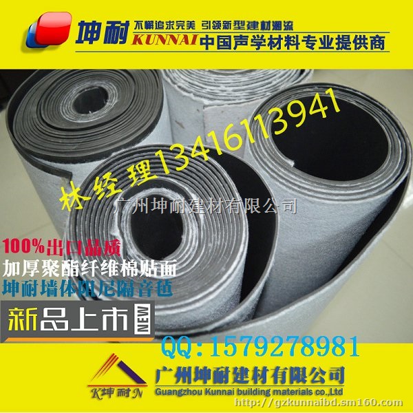 坤耐品牌隔音毡:隔音毯、隔音胶、阻尼毡,高阻隔音毡材料超薄、柔软、拉伸强度大;施工方便、成本低;阻燃、防潮、防蛀;最重要的特点是材料环保、内阻尼大、隔声性能强,隔音毡对低频和高频声音均有相当好的抑制作用,能有效地抑制各种振动的传播;隔音毡由于面密度很大,自身不容易产生振动,也能阻止其附着物产生振动,从而能有效地防止并最大程度的隔绝掉物体撞击、机械设备震动、卫生设备及管道壁等产生的噪音,具备减振效果,是一种阻尼隔声材料.
