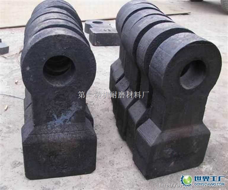 锤头现在市场上的破碎机锤头根据制造工艺可以分为两种:铸造和锻造,但是他们的耐磨程度是不一样的。由于破碎物料,头部需要良好的耐磨性而柄部又需要足够韧性,通常用合金钢、高锰钢、铸钢加高铬铸铁双金属复合等材料用锻造或铸造方法一次成型,配上相应的热处理工艺就比较经济一点,破碎机锤头根据材质可以分为种:高锰钢锤头、双金属锤头、复合锤头、大金牙锤头、中铬合金锤头,硬质合金锤头等.主要因素是二氧化硅的含量,现代工业下的技术表明:采用硬质合金锤头在耐磨性上表现良好。