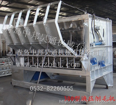 300型生猪液压刨毛机,是目前我国屠宰场生猪刨毛的设备。本机刨毛空间开阔,刨毛时间由人工控制,对不同地区的不同猪种和大小不同的猪体均可适用。在此机前配有烫池或摇烫机,使猪体均匀的浸烫后再投入本机,方可取得优质的脱毛效果。本机可连续作业,适合大、中型屠宰场使用。 1、生产能力200-250头/h 2、最大负荷310kg 3、刨毛时间30-40S 4、刨毛长度2.39m 5、刨毛轴转速208r/min小滚筒轴61r/min大滚筒轴124r/min软刨轴210r/min 6、外形尺寸3280*3050*2500mm长*宽(耙)*高 7、总重量4000kg