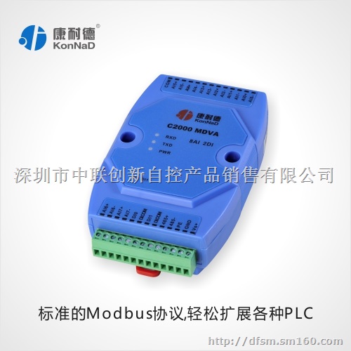 C2000 MDVA为通道隔离型智能模拟量数字量采集器,8路电压型模拟量输入(量程为0~5V),采用满量程通道隔离、全差分输入设计。2路数字量(干接点)输入,RS485接口光电隔离和电源隔离技术,有效抑制闪电,雷击,ESD和共地干扰。为系统集成商、工程商集成了标准的Modbus RTU协议。通过RS-485即可实现对远程模拟量和开/关设备的数据采集和控制。下层设备通常有接近开关、机械 开关、按钮、光传感器、LED以及光电开关等数字量开关设备及PH、电导计、温度计、湿度计、压力计、流量计、启动器和阀门等模拟量设备。