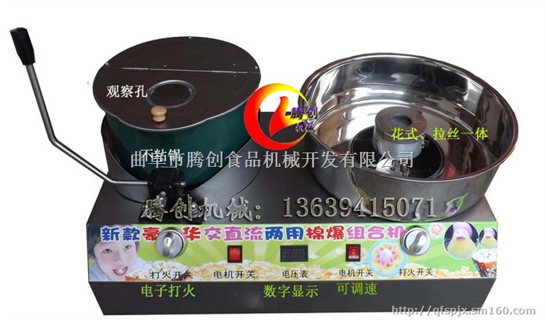 最新电动爆米花棉花糖组合机,彩色花式棉花糖爆米花组合一体机,一边做爆米花,一边做棉花糖。做爆米花锅最新升级为不粘锅材质,操作起来更加得心应手!完美的爆米花棉花糖组合机,在做棉花糖浪费的糖可以用在做爆米花里,超级无敌黄金搭档。彩色果味棉花糖兼多种口味爆米花,客户想要什么来什么。同时工作只需配一块12伏电瓶,接一个煤气罐,流动作业更方便,棉花糖和爆米花两功能互不影响,放在三轮车上在人多的地方几天就能收回成本。