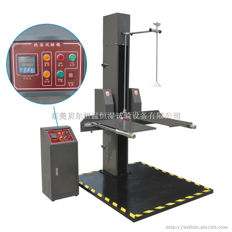 2、双臂跌落试验机:本机可对包装件的面、角、棱作自由跌落试验,配备数显高度显示仪及采用编码器进行高度跟踪,从而能精确地给出产品跌落高度,与预设跌落高度误差不超过2%或10MM。本机采用双臂结构,具有电动复位、电控跌落及电动升降装置,使用方便;独有的缓冲装置大大的提高了机器使用寿命、平稳性及安全性。双臂设置,可方便地放置产品,跌落角度冲击面与底板平面义度误差小于等于5°。