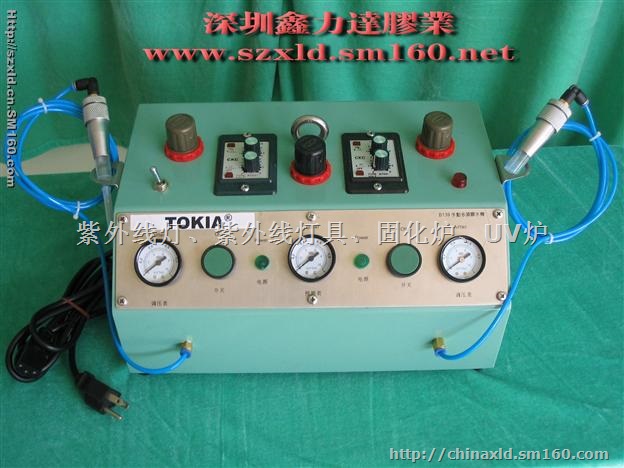 TOKIA(拓嘉)T-771型半自动点胶机功 能:1, 控制单动点胶阀或点胶针筒内胶水等液体的定量供给。2, T-771型微型点胶机是针对胶水等液体需要定量供给场合而设计的点、线涂胶控制器,数字式电路计时控制可保证点胶机的精度和可重复性点胶周期,消除普通点胶机直接使用数显机械式计时器导致的重复误差。3, T-771型微型点胶机安装有可调节负压发生装置,可根据胶水的粘稠度不同而调整对针筒内胶水产生的回吸力,保证点胶结束时针头处及时收胶并防止胶水溢漏;外部旋钮式调节,操作方便、简单。特点:1, 数字电路定时控制器;2, 真空负压可调至380毫米汞柱;3, 脚踏板控制或外接自动化设备信号源4, 配有两个终端点胶头,可双人同时操作适用液体:黑胶.硅胶.黄胶.UV胶.SMT红胶.水晶胶.螺丝胶.喇叭胶.木工胶.防磨胶.矽胶.油漆.银浆.阻尼剂.焊锡膏.环氧树脂.磁流体.松香油.酒精.清水.油墨.润滑油.药液.技术参数:电源:AC 220V±10%????? 50/60Hz;功耗:16VA气压源:MAX 9.5kg/cm2(0.94MPa)干燥压缩空气;气压调整范围:0.2~7.0kg/cm2(0.02~0.69MPa);涂胶时间调整范围:可根据实际使用需要分四个时间段进行调节:0.01~1sec(用于精密微量点胶);0.01~4sec(用于普通小胶量点胶);0.01~10sec(用于普通胶量或粘稠较高场所);0.01~30sec(用于大胶水量或粘稠较高场所)?;动作方式:定时吐出胶水、连续吐出胶水;涂胶开始信号:脚踏开关等无源的常开(N.O.)触点输入( 触点容量DC5V 20mA )( 切换内部选择开关可进行DC5V、DC12V、DC24V加电压输入转换 )、输入信号自锁;涂胶结束信号:采用继电器常开(N.O.)触点输出,容量AC250V3A、DC30V3A;真空功能:内含真空发生器;使用温度范围:+0℃~+45℃;外形尺寸(mm):350(W)x215(D)x150(H);重量:4.5kg; 附件:脚踏开关。