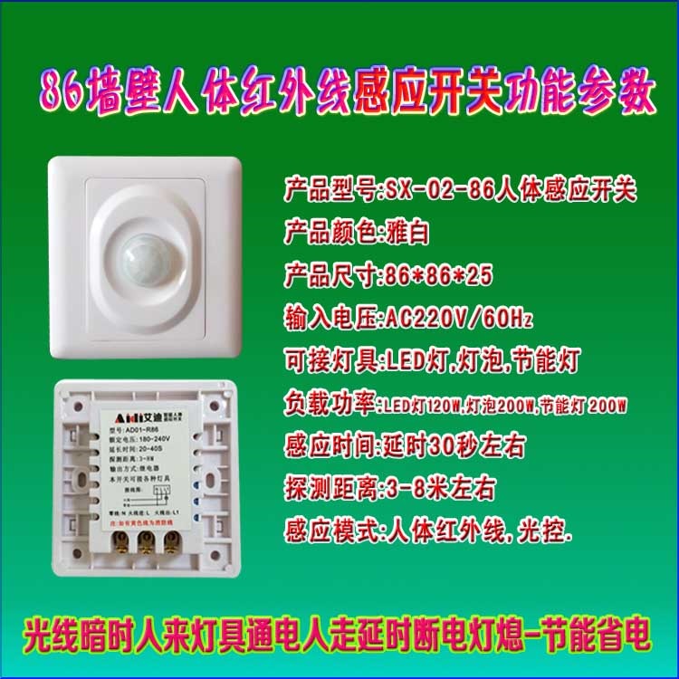 86墙壁人体红外线感应开关批发人走延时断电2线_人经过灯具附近自动感应通电,人离开时自动延时40秒左右断电,节能省电,安全