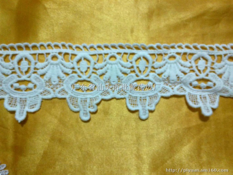 相册。我厂生产蕾丝花边,水溶花边,棉线花边,牛奶丝花边,涤光花边,刺绣花边,网布花边,棉线水溶花边,棉线条码花边,棉线胸花,棉线朵花,棉线领花,服装花边,睡衣花边,内衣花边,床上用品花边,箱包花边,玩具礼品花边,外贸服饰花边等等。花边产品的材质有:棉线,牛奶丝线,涤光丝线,锦网布,涤网布等相关材质,可根据客户的实际要求,在花边产品款式确定的前提下进行材质的更换,花边产品款式不变。厂内有设计制版中心,根据客户来板来样的具体要求,