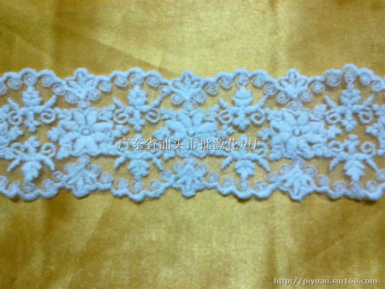 更多花边产品图片请查看工厂QQ359892857相册。我厂有设计制版中心,可根据客户来板来样的具体要求免费起板打样,确认后下单生产大货,同时,每季度不间断的推出新潮花边款样并适量生产大货,以满足客户现货的需要。我厂生产的刺绣花边产品包括:棉线刺绣花边,牛奶丝刺绣花边,涤光丝刺绣花边,刺绣花边条码,刺绣胸花,刺绣朵花,刺绣领花,刺绣面料花边,网布刺绣花边,欧根纱刺绣花边,钻石网刺绣花边,锦网刺绣花边,定型纱刺绣花边等等。产品可广泛用于女式时装,睡衣,内衣,家纺用品,玩具礼品,窗帘台布……。欢迎来电咨询,来板定做!