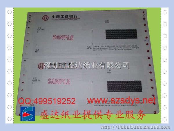 产品属性:成品为两边带电脑打印孔,适用针式打印机套打。采用高级无碳环保原纸,纸质全白原纸.常用二联或三联多尺寸订制。无碳纸显色清晰,少纸粉。挺度好,打印不易出现卡纸,对打印机损耗小。纸张厚度常用为上纸联55克,中纸联50克,下纸联80克.特殊的有80克.120克。三联式银行密码纸、金融密码函较为常用。使用套打时三联一起进纸打印、打印后第一联取出企业留存或销毁。二三联是密封的。发给用户。用户收到密码封后要撕开密封纸在内页正面(第三联正面)方可看到保密内容明细。我司选用多种不同保密纹供客人选用,保证银行、金融密码函纸保密效果显著。可按客人要求印上企业LOGO及中英文公司名等,有效提升企业品牌的形象。对于所有印刷品我司均采用高级环保油墨加工印制,与纸融合好,不掉墨,版面美观。