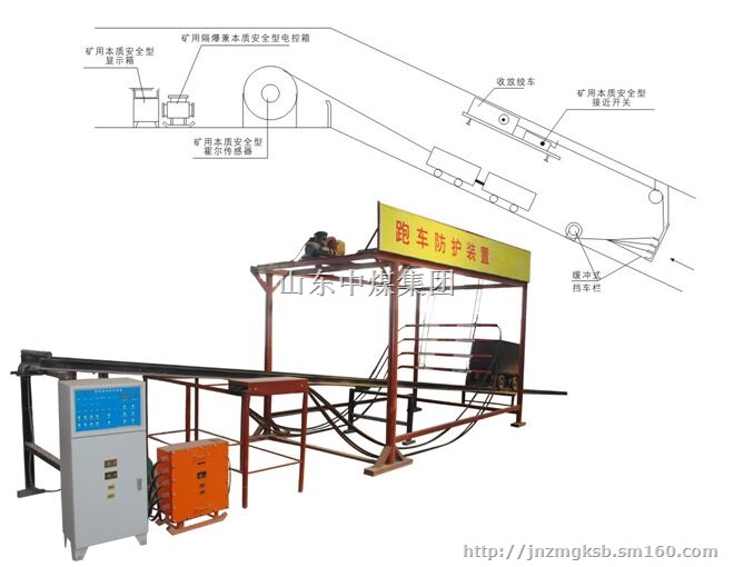 跑车防护装置主要用于煤矿主斜井巷道,采用位置传感器获取与绞车同步运行的控制信号,使挡车网处于“常闭式”防护状态,如因断绳、脱钩等原因而发生跑车事故,可采用柔性缓冲器来进行有效拦截。避免人员及其它设备受伤,是矿上必不可少的安全设备之一。