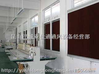 水帘降温是通过蒸发降温的一种高效经济的降温方式。干热空气通过水帘进入室内,由于水帘内孔壁均匀布满水膜,这样室外新鲜空气穿过水帘时,水帘上的水会吸收空气中的热量并产生蒸发现象,使新鲜空气温度下降,湿度增加,完成降温过程,从而使厂房里的空气变得凉爽、湿润。