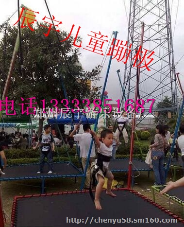 三、用途它是提高儿童综合素质的最好游乐器材之一,还可让关节和肌肉受到特有的拉力,又能健身又有很强的趣味性。不仅可以健身,还可锻炼胆量,一举多得。四、产品的一些注意事项 1、儿童蹦极跳床只能在公园,休闲性广场,步行街等没有车流的地方使用. 2、该蹦床适合1岁到10岁(体重不超过35公斤)年龄段的小朋友 3、三岁以下的小朋友在玩儿童蹦极时必须系好安全带并在成人的监护下方可玩. 4、经营者在每次经营前必须细心检查安全带是否系好,绳子是否固定好.方可让小朋友玩. 5、经常检查蹦极跳床上的各种部件是否有松动或是损坏,发现有损坏的及时更换. 6、经常不定时的用干布擦拭儿童蹦极网布,保持干净卫生