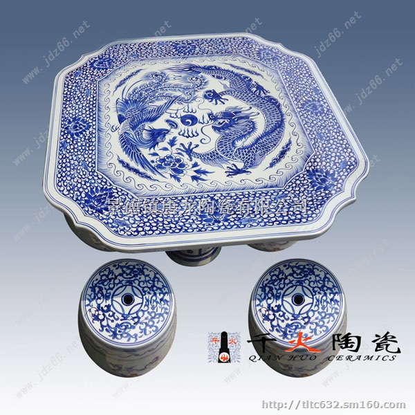 唐龙陶瓷桌椅选料讲究,经过1300多度高温烧制而成,绿色环保。厂家生产陶瓷桌子凳子,样式齐全,有圆桌、方桌、八角桌等等,您也可以来样定做,还可以添加自己的logo。在目前来说,陶瓷桌椅以其性价比高的优势,在我们公司的销量还是很大的,也得到很多客户的赞美。我们公司有手绘青花陶瓷桌椅、墨彩休闲桌凳、粉彩陶瓷桌椅、色釉龙纹仿古陶瓷桌椅。桌面内容更是丰富,有青花童子图案、粉彩百子图、粉彩仕女、手绘青花山水、青花龙凤呈祥图案、八仙过海青花图案、粉彩牡丹游鱼等各种图案。我们有专业的设计团队和经验丰富的生产团队,设计生产出来的陶瓷桌椅屡获好评。