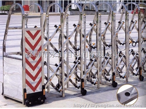 电动伸缩门主体结构特点:不锈钢采用国际标准不锈钢原材料,经过特殊工艺制管进行折弯焊接定型制成门体。门体永不变型坚固耐用。门体用大小连杆连接而成伸缩门,大连杆连接型式为古币梅花式,小连杆连接成菱型式道闸,美观大方,坚固耐用。不锈钢伸缩门活动部位特点:伸缩门每个活动部位环节均采用不锈钢管,轴,轴瓦,不锈钢螺母,尼龙衬垫组装,组装时每个环节点加注高级润滑油,无噪音伸缩自如。