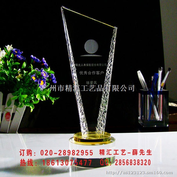 【产品介绍】:产品是经过切割、打磨、打孔、抛光、雕刻等多道手工工艺精心打造而成。水晶奖杯质感高雅,晶莹剔透,是年会颁奖典礼,表彰大会,评选活动,员工会议最佳选择