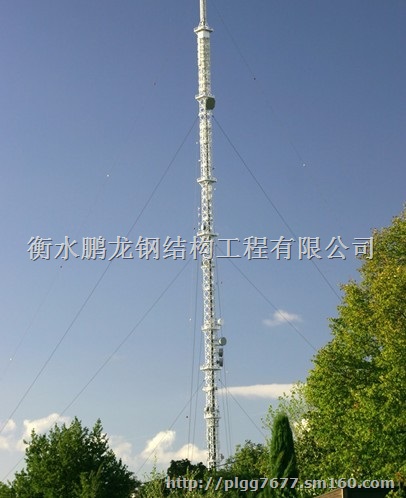 我公司专业生产角钢拉线塔、圆钢拉线塔。拉线塔又名桅杆塔,主要由一根矗立的细长杆身和沿高度斜向布置的数层纤绳所组成,杆身为主要的承重结构,纤绳在三个或四个方向拉住杆身,以保证杆身的直立和稳定。杆身有独立钢管实腹结构,也有用钢管、圆钢、角钢组成的桁架式结构。纤绳采用多股高强度镀锌钢绞线。拉线塔的与自立塔相比优点为节省材料,建设周期短,缺点为占地多,易失衡。