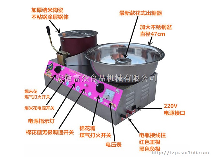 阜阳富众机械15855842368提供手抄圆形爆米花机,电动爆米花机,美式圆球形爆米花机独特造型豪华而又气派,是当今最实用新型公开了一种球形爆米花机,包括底座、固定在底座上的外壳、下部外壁上带有多个风道口的内胆、电机及固定在电机的动力输出轴上的风扇。一个上端和下端都带有开口的固定罩固定在外壳的底部,内胆插入固定罩的上端开口,多个风道口位于固定罩内;在固定罩内固定有一个支撑内胆的绝缘隔热板,绝缘隔热板的上端面设置有弹性导体,弹性导体抵接内胆的底面,绝缘隔热板的夹层内设置连接弹性导体的电路导线;固定罩的下端开口处固定有电机,电机动力输出轴上的风扇位于固定罩内,在固定罩上方的内胆外壁上套有一个连接电源的导流圈,导流圈、内胆、弹性导体和绝缘隔热板夹层中的电路导线构成内胆加热支路。