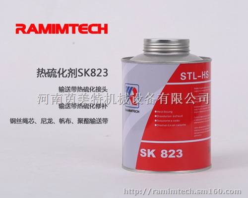 茵美特热硫化胶浆SK823,德国进口热硫化材料。黑色液体,粘稠度较低,有很好的流动性,主要涂刷在皮带接头的对接面及需要铺芯胶、面胶的部位,均匀涂刷后可完全渗入织物层,纤维层、钢丝绳缝隙等,溶剂易挥发,需在涂刷后较短时间开始进行硫化。涂刷过热硫化胶浆后,胶料在热硫化时与接头完全融合为一体,不留缝隙,接头强度可达到与原皮带一致。