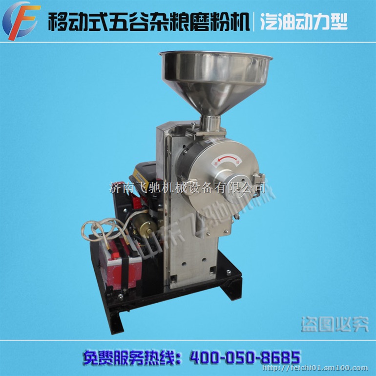 五谷杂粮磨粉流动使用借不到电源怎么办?飞驰全新改良款汽油机动力五谷杂粮磨粉机,汽油机动力,移动使用方便,不用再为找不到电源而烦恼。
