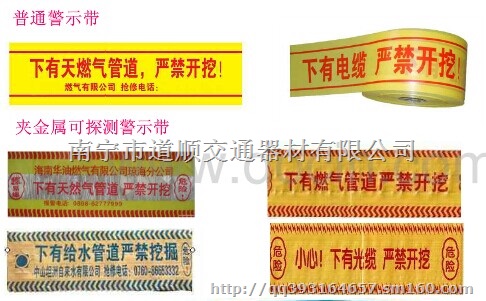 警示带有两种:一种为普通警示带;另一种为夹金属可探测警示带又称示踪带,(带不锈钢金属警示带),且该产品采用高强度、耐老化的高分子材料,以 PE、PP、OPP为主要原料,经防腐处理加工而成,耐腐蚀性能好,色泽鲜艳、醒目,长期铺设在地下50年不腐蚀不褪色,符合长期埋地质量不变要求。
