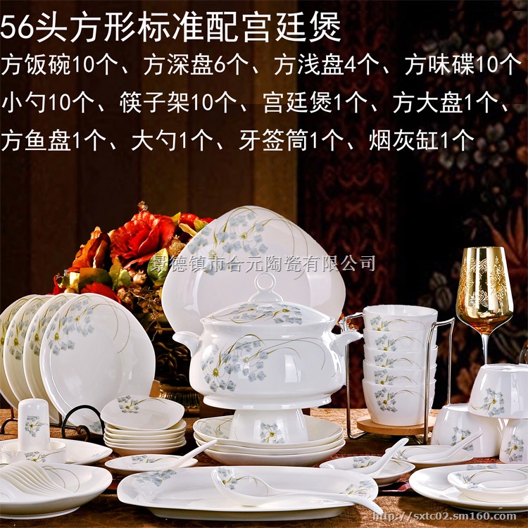 56头实用:16饭碗、10盘子(6深4浅)、4面碗、10小勺、10筷子架、1烟灰缸、1牙签筒、1大勺、1个10寸平盘、1个12寸鱼盘,1汤碗或品锅或宫廷煲