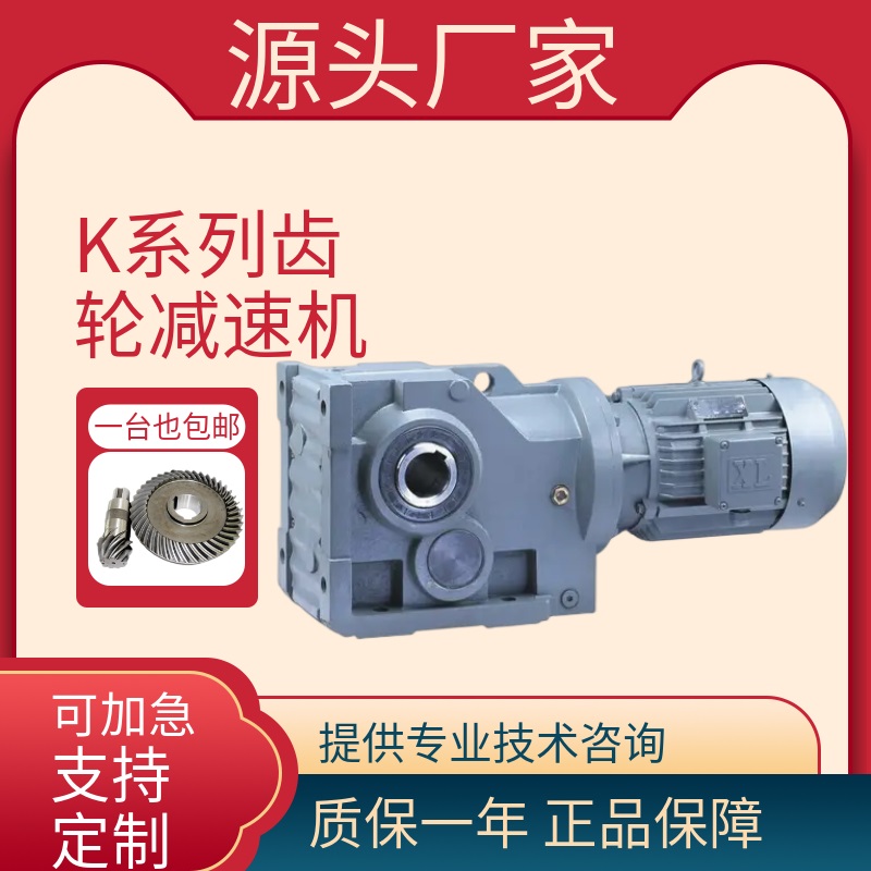 K系列减速机,结合国际技术要求制造,具有很高的科技含量,节省空间,可靠耐用, 承受过载能力高,功率可达200Kw,能耗低,性能优越,减速机效率高达95%以上,振动小,噪音低,节能高,选用优质锻钢材料,钢性踌铁箱体,齿轮表面经过厂渗碳淬火,经过精密加工,构成了斜齿轮、伞齿轮,锥齿轮传动总成的减速机配覆各种类电机,形成机电一体化,完全保证了产品使用质量
