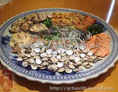 景德镇古成陶瓷自成立以来,推出海鲜大瓷盘。现已为广东,浙江,江苏等地的多家酒楼定制过海鲜大瓷盘、海鲜大瓷盘的特色以巨型瓷盘与其独特的餐饮风格,独特的饮食气氛,形成了一道特色的招牌菜系。海鲜大瓷盘深受广大客户的追求和喜爱。我厂生产的海鲜大瓷盘画面是采用景德镇传统手工绘制的。画面有富贵牡丹、江南水乡、亭台楼阁、青花山水等经典画面,画面可以根据客户需求定做。海鲜大瓷盘的主体工艺制作,采用全手工制作。海鲜大瓷盘的原料必须采用景德镇原产的高岭土(高白泥)以及独有的传统手工拉坯工艺成型。因此制作海鲜大瓷盘都是老师傅手工拉坯。修胚待泥胚干燥后,纯手工绘制图案。这是现代贴花工艺不可企及的。而这仅仅是其中的一部分,海鲜大瓷盘最后成型取决与窑火烧制(古有十窑七不成的说法)就像我们制作10块150公分的瓷盘就必须要准备15块泥胚。甚至可能会更多。可想这不仅是我们日用的瓷盘。更多的是一件艺术品。
