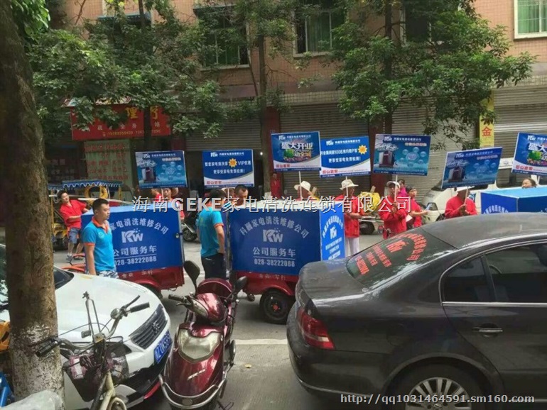 店面其他硬件:废旧洗衣机、空调、油烟机、热水器放置在专属的展示区,以便给消费者介绍各种电器污染的位置和我们的解决方案,同时我们在外做宣传的时候也可以带出去。电脑、固话、派工单、帐篷、展架、横幅等等配置也都是必须的。不过这些都可以在格科总部一站式采购了!
