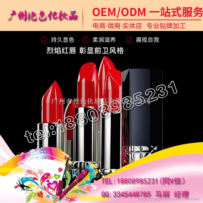 广州艳色有限公司是一家专注彩妆系列产品加工的大型生产厂家,集研发、生产及销售为一体的专业化妆品OBM/OEM/ODM加工企业,在行业内颇具口碑、影响力。标准GMPC认证厂房,品质有保障。欢迎来电咨询 18808985231